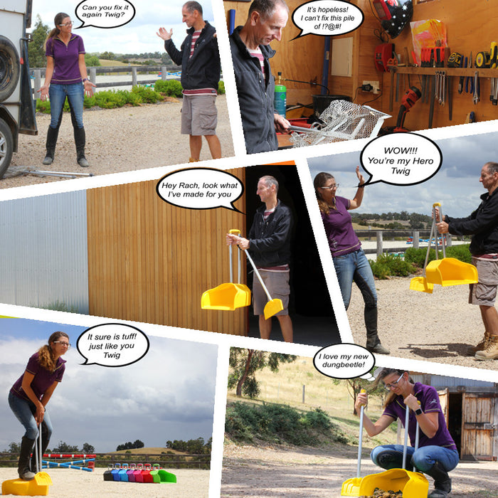 Terrified by the prospect of having to do constant repairs on yet another purchased scoop, Twig put to work his years of experience designing prototypes to create something stronger and more durable. He emerged from the shed with a beautifully crafted bright yellow scoop that would change the face of horse poo collection!